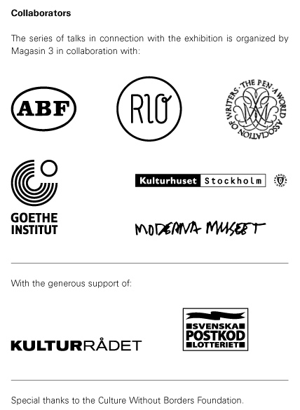 In connection with the exhibition Magasin 3 has organized a series of events in collaboration with ABF, Bio Rio, Goethe-Institut, Moderna Museet and Swedish PEN/Kulturhuset, Hotade ord. With the generous support of Kulturrådet and Svenska PostkodLotteriet. Special thanks to the Culture Without Borders Foundation.