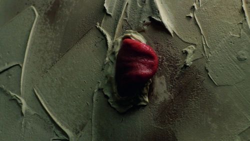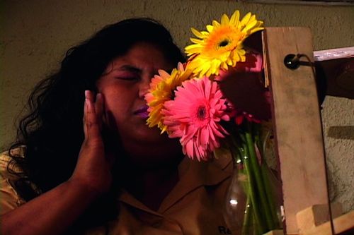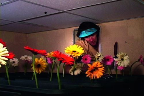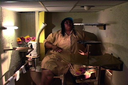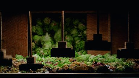 A large woman emits a mysterious energy that appears to fuel the entire process, as the literal squeezing of another woman results in the manufacture of pink make-up. Mixed with the mashed-up iceberg lettuce from Arizona and rubber from Kerala, it all gets compressed into an unsightly cube. Tongues, lips and bottoms protrude from different holes in the wall and are sprayed and attended to at regular intervals. The hands of faraway farm workers reach into the factory and are massaged by a team of Asian women. A service economy is being serviced, and as everyone comes to depend on each other, the film addresses the very human driving force that sustains our global economy.