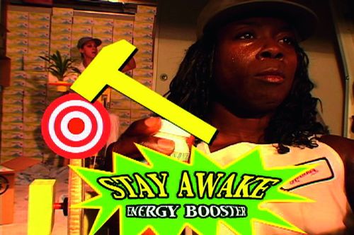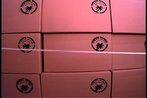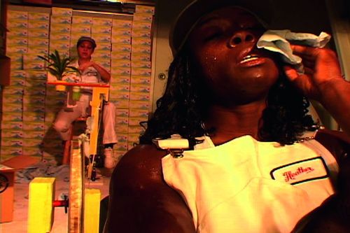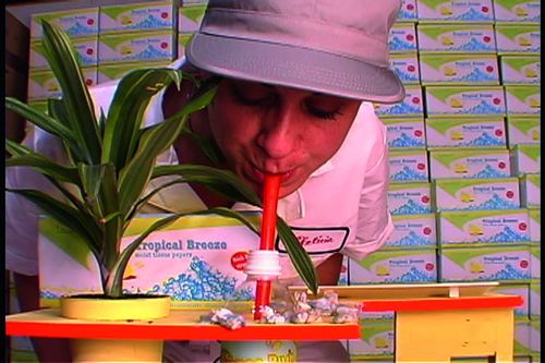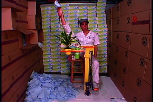In the work Tropical Breeze, lemon-scented moist tissues of the fictive brand Tropical Breeze, are being produced in a short assembly line made up of only two women. In the back of a truck, a woman seated on an exercise bike picks up a dry tissue with her toes, attaches it to a primitive pulley mechanism with a gum she is chewing, and transports the tissue towards the front of the truck. Here the driver, a heavily perspiring muscular woman, wipes sweat from her forehead onto the same tissue, and returns it to be packaged and branded. Surrounded by stacks of large boxes carrying the Tropical Breeze logo, the two women together engage in producing and delivering a product.