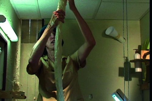 Through the surreal and disconcerting production methods, and the discrepancy between the input effort and the output value, Dough elaborates on the complex relationship between the women themselves and the product they make. In the semi-industrial setting of this film, the lengths of dough handled by these women seem to take on the characteristics of their own flesh; something to be managed and tended, revered, controlled and pampered. The particular physiques of the women playing the factory workers begin to blend with the product itself, causing product and identity, production and result, to merge, destabilizing the meaning and value of labor. In Dough, the human physicality invested and contained in the process of labor and its structures, is being directly transported into the product, as intimate energies and fluids are excreted by the workers and transformed into a single saleable unit.
