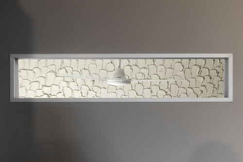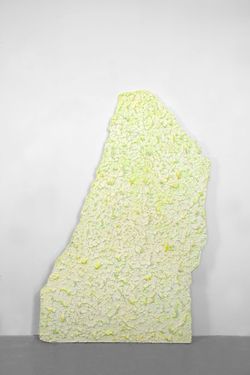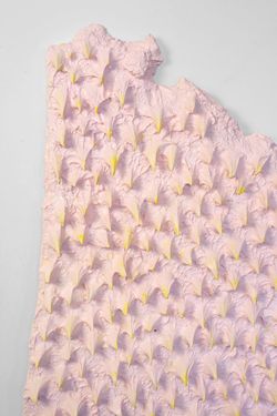 For this exhibition at Magasin 3, Mika Rottenberg has created a group of six sculptures. This is the first time her work is purely object-based, and as the moving image is no longer an intrinsic part of the whole, this represents a new direction. The sculptures appear as if they have been torn from the walls of one of her film-sets, and simply propped up against the gallery wall. In reality, these are plastic casts of the kind of rough wall structures made out of plaster that often appear in her films.