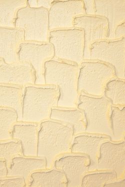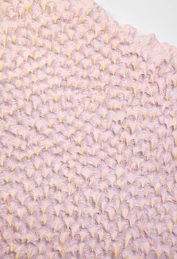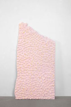 Textures are key elements of all of Rottenberg’s films and installations. She responds to her environment with a stronger focus on the physicality of objects, than on their purely visual qualities. Experiencing her work often involves seeing and hearing the impact of one surface material upon another; the thud of a ball of soft dough against a flimsy piece of wood; the whirring of simple machinery; the squelch of ingredients in the process of becoming commercial products. Cheap aesthetics and the everyday are recurrent themes in Rottenberg’s work. As sculptural objects, these textures gain a new significance, even as they retain some of the associations of the low-end and makeshift. Rottenberg hones in on her perpetual fascination for how day-to-day textures are perceived, felt, ignored and lived with. As independent panels, these structures push beyond the boundary of the mundane and assert themselves as aesthetic objects. The democratic and the everyday – that which is seen to have no particular function beyond merely blending in – has been distinguished and made noteworthy.